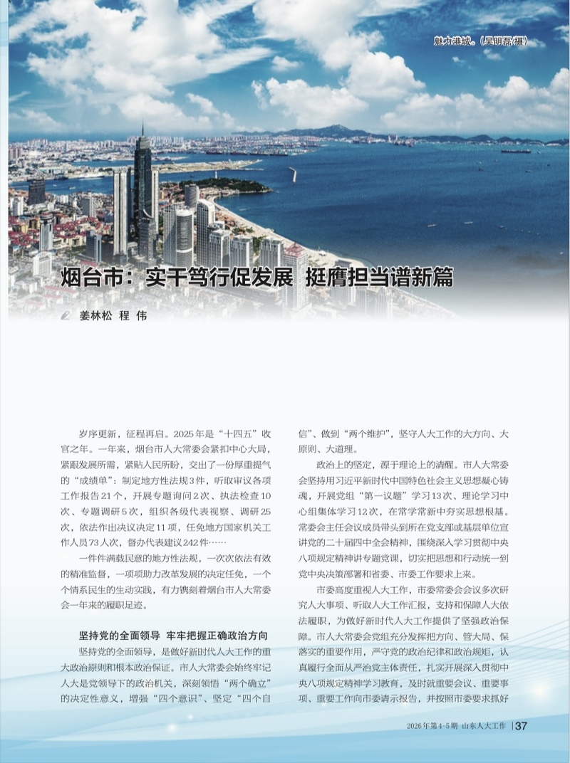 岁序更新,征程再启。2025年是“十四五”收官之年。一年来,烟台市人大常委会紧扣中心大局,紧跟发展所需,紧贴人民所盼,交出了一份厚重提气的“成绩单”:制定地方性法规3件,听取审议各项工作报告21个,开展专题询问2次、执法检查10次、专题调研5次,组织各级代表视察、调研25次,依法作出决议决定11项,任免地方国家机关工作人员73人次,督办代表建议242件…… 一件件满载民意的地方性法规,一次次依法有效的精准监督,一项项助力改革发展的决定任免,一个个情系民生的生动实践,有力镌刻着烟台市人大常委会一年来的履职足迹。 坚持党的全面领导 牢牢把握正确政治方向 坚持党的全面领导,是做好新时代人大工作的重大政治原则和根本政治保证。市人大常委会始终牢记人大是党领导下的政治机关,深刻领悟“两个确立”的决定性意义,增强“四个意识”、坚定“四个自信”、做到“两个维护”,坚守人大工作的大方向、大原则、大道理。 政治上的坚定,源于理论上的清醒。市人大常委会坚持用习近平新时代中国特色社会主义思想凝心铸魂,开展党组“第一议题”学习13次、理论学习中心组集体学习12次,在常学常新中夯实思想根基。常委会主任会议成员带头到所在党支部或基层单位宣讲党的二十届四中全会精神,围绕深入学习贯彻中央八项规定精神讲专题党课,切实把思想和行动统一到党中央决策部署和省委、市委工作要求上来。 市委高度重视人大工作,市委常委会会议多次研究人大事项、听取人大工作汇报,支持和保障人大依法履职,为做好新时代人大工作提供了坚强政治保障。市人大常委会党组充分发挥把方向、管大局、保落实的重要作用,严守党的政治纪律和政治规矩,认真履行全面从严治党主体责任,扎实开展深入贯彻中央八项规定精神学习教育,及时就重要会议、重要事项、重要工作向市委请示报告,并按照市委要求抓好落实。 去年年初,全市高质量发展示范城市建设推进大会召开后,市人大常委会第一时间发出倡议书,动员全市各级人大和人大代表在高质量发展新征程中建功立业;常委会主任会议成员带头做好市委交办的重点产业链培育等工作任务,积极主动搭建合作交流平台,推动开展政企、银企、校地对接活动,真正做到党委工作重心在哪里,人大作用就发挥到哪里,力量就汇聚到哪里。 着力提高立法质量 以良法保善治促发展 改革发展向前一步,法治就要跟进一步。市人大常委会坚持改革和法治相统一,推进地方立法工作有为、有力、有效,以精准有效的法治供给护航发展。 创新是城市发展的不竭动力,是高质量发展的澎湃动能。市人大常委会注重强化科技创新对绿色低碳高质量发展的驱动作用,分民营企业、新一代信息技术企业、驻烟高校等多个层面召开立法座谈会,征求各方面的意见建议50多条,制定 《烟台市科技创新促进条例》,为打造区域科技创新中心、培育壮大新质生产力提供了有力的制度支撑。 烟台海域面积达 1.23 万平方公里,海岸线长1071公里。近年来,海上养殖、海上运输、海上旅游、海上风电等新业态迅猛发展。为有效解决新出现的海洋资源开发用海与海上交通用海的矛盾问题,制定《烟台市海上交通安全条例》,维护海上生产、海上旅游、海上运输等安全,补齐全市安全生产工作关键一环。 民之所盼,立法所向。围绕解决群众普遍关注的“停车难”问题,在前期组织专题询问、推动开展专项整治的基础上,制定 《烟台市停车管理条例》,推动停车管理由“治标”走向“治本”,让市民在法治进步中不断增强获得感。 这一年,市人大常委会持续加强开门立法、民主立法,组织召开有关立法座谈会、论证会16次,收集意见建议200余条,基层立法联系点成为公众有序参与立法的“民意直通车”,一款款务实管用的法条在反复讨论中相继诞生;地方立法研究院和3个地方立法基地、6个专家团队、30名立法顾问全过程参与立法,制定的各项法规具有更坚实的法理支撑、展现更高超的专业水准……“智库”“外脑”作用得到充分发挥,制定出台的每一件法规都建立在坚实的民意基础之上。 有效实施精准监督 护航城市高质量发展 心怀“国之大者”,情系“民之关切”。市人大常委会始终坚持寓支持于监督之中,综合运用法定监督方式,以更加精准的靶向监督推动问题解决、工作改进。 “如何精准发力培育新的经济增长点?”“怎样推动中小企业数字化转型?”……2025 年10月,在绿色低碳高质量发展示范城市建设工作推进情况专题询问中,12位询问人接连发问,每个问题都戳中工作中的重点、堵点。而这场专业专注的询问,建立在广泛走访调研、收集近百条意见建议的基础之上。在群众关注的市区违法建设治理专题询问中,代表们同样敢于碰硬、“辣味”不减,围绕提高执法认定效率、加强指导监管等核心问题接连追问,与相关部门(单位) 深度对话、共商对策,推动形成了更精细、更可持续的城市更新路径。 民生福祉,枝叶关情。市人大常委会始终把人民群众的急难愁盼放在心上,组织对全市中小学生公共服务保障、人工智能赋能课程改革、乡村医疗卫生服务能力提质增效、居家和社区基本养老服务提升等工作情况进行视察,推动提高基本公共服务均等化、优质化水平。围绕让居民喝上放心水、用上放心气,采取“实地检查+专业